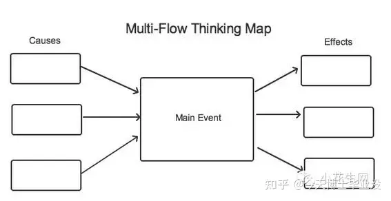 多重流程图主要用来描述一个事物的因果关系。绘制时首先定义核心方框,描述这个事情,之后再在左边方框描述事件产生的原因(用箭头指向核心方框),右边填写事件的结果(用箭头从核心方框引向结果方框)。这是一个先后顺序的过程,能够看到事件发生的原因和结果,通过考虑原因和结果来分析为什么,结果是什么。