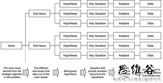 上图中:源自战略目标或问题的主要问题→由主要问题衍生出来的不同次级问题→最佳猜测或假设→能为假设提供答案的问题→回答问题所需的分析→进行分析所需要的数据和此类数据的来源